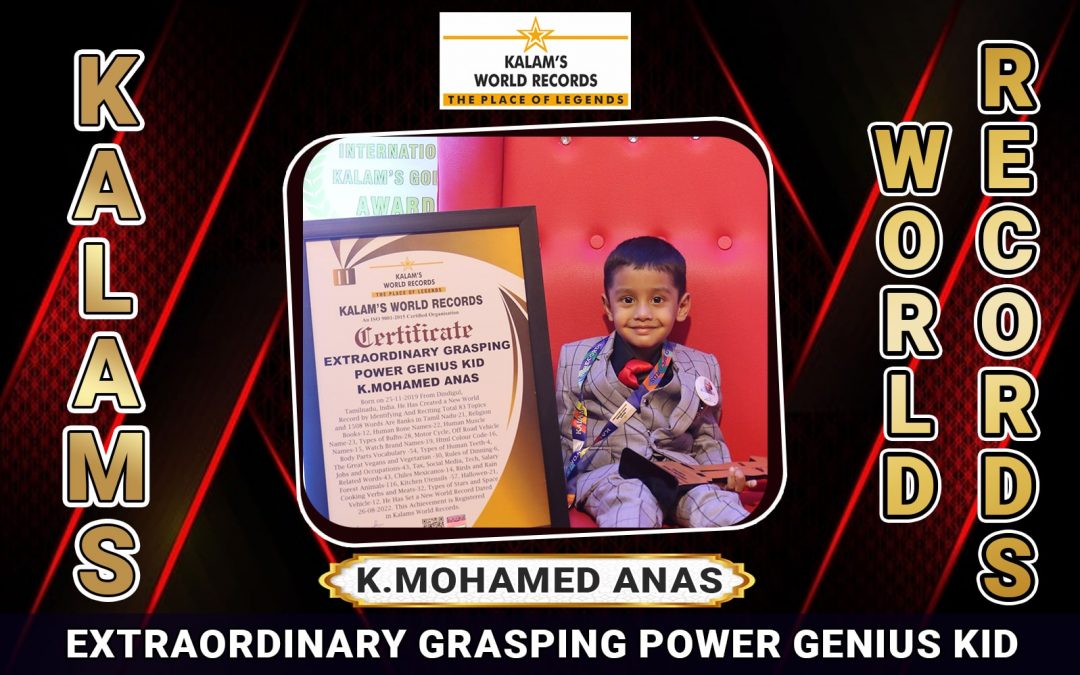 Born on 25-11-2019 From Dindigul, Tamilnadu, India. He Has Created a New World Record by Identifying and Reciting Total 83 Topics and 1508 Words Are Banks in Tamil Nadu-21, Religion Books-12, Human Bone Names-22, Human Muscle Name-23, Types of Bulbs-28, Motor Cycle,off Road Vehicle Names-15, Watch Brand Names-19, Html Colour Code-16, Body Parts Vocabulary -54, Types of Human Teeth-4, the Great Vegans and Vegetarian -30, Rules of Dinning -6, Jobs and Occupations-43, Tax,social Media, Tech, Salary Related Words -43, Chiles Mexicanos-14, Birds and Rain Forest Animals-116, Kitchen Utensils -57, Hallowen -21, Cooking Verbs and Meats-32, Types of Stars and Space Vehicle -12. He Has Set a New World Record Dated 26-08-2022. This Achievement is Registered in Kalams World Records.