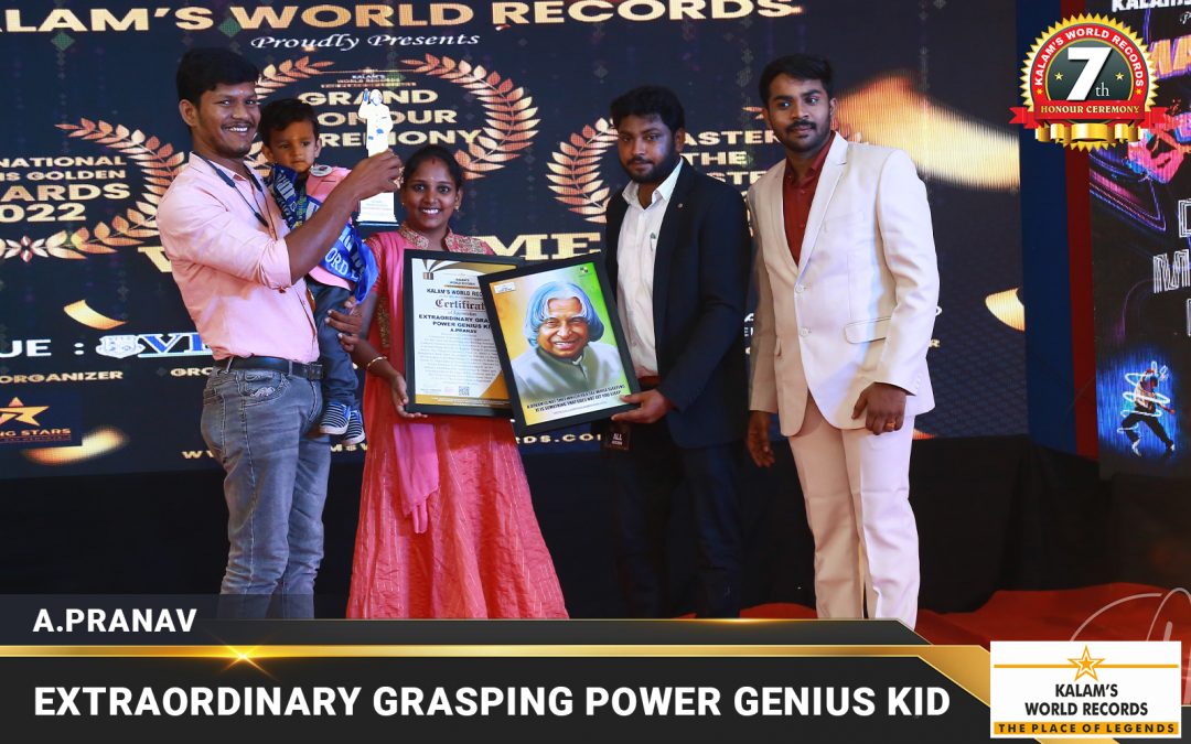 A.PRANAV Born on 12-05-2020 from Coimbatore, Tamilnadu, India is appreciated for his talent by identifying and reciting National symbol-8, National leaders-3, Study item-9, Vegetables-8, Common