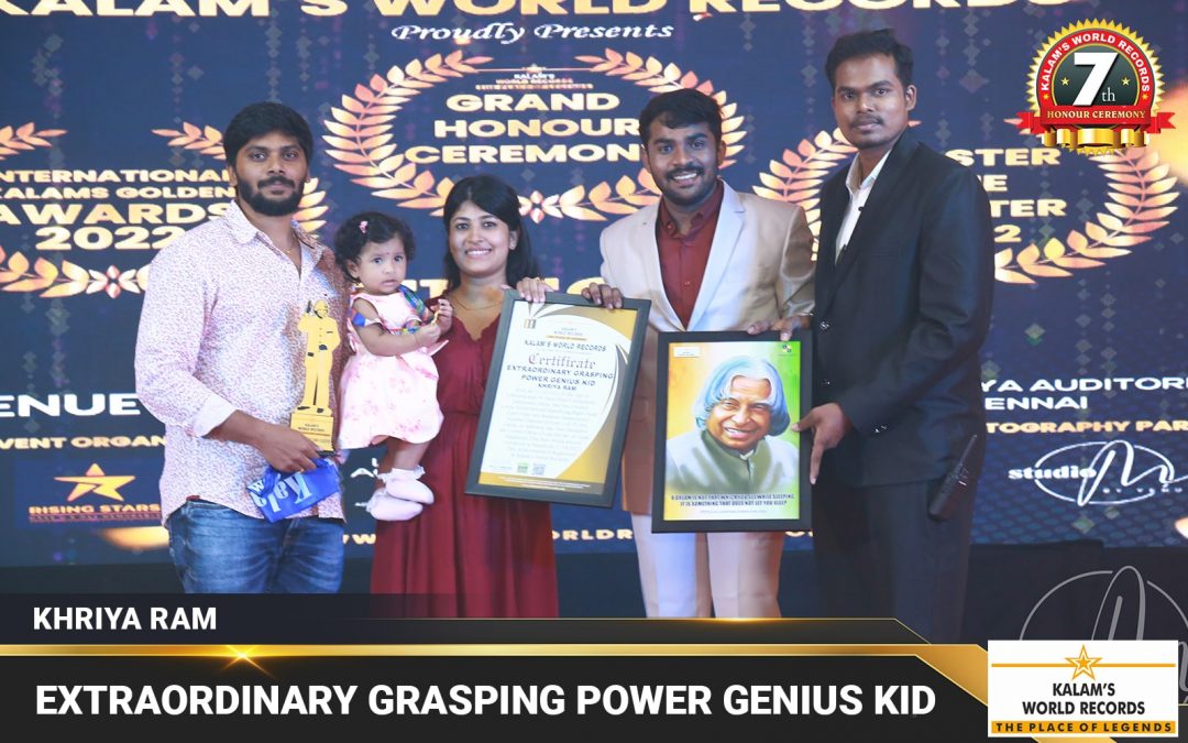 Born on 11-02-2022 at the Age of 5 Months and 26 Days From Coimbatore, Tamilnadu, India. She Has Created a New World Record Identifying Right Flash Card From Any Random Quantitative Number Displayed From 1 to 70 Dot Cards. In Addition, She Also Identifies the Correct Object From the Set of Cards Displayed. This New World Record Certificate is Issued on 15-10-2022. This Achivement is Registered in Kalam’s World Records.
