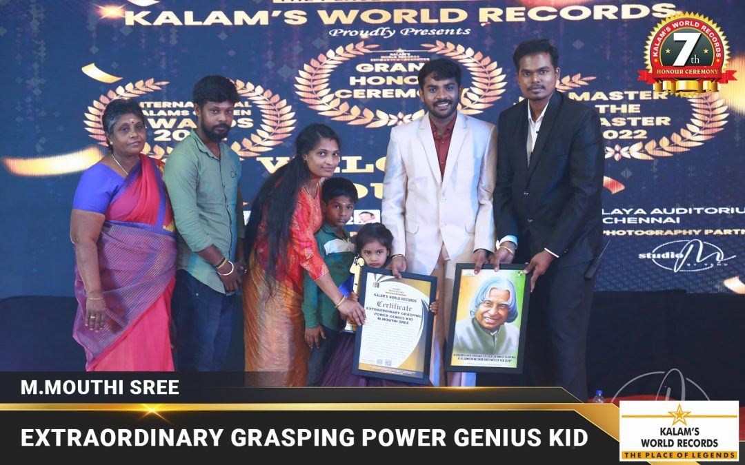 Born on 29-03-2018 From Chennai, Tamilnadu, India. She Has Created a New World Record by Identifying and Reciting 33 Topics in 6 Minutes That is State Name and Capital Name- 29, Country Name and Currency Name- 15, Vegetables- 15, Fruits-15, Flowers- 15, Planets Name-11, National Leaders Name-15, Continents- 7, Mi Welcome Speech, Vowels Sound, Seasons, Good Habits, Shapes-7, Colors-10, Community Helpers-15, National Symbols of India-15, Parts of the Body -15 18. Wild Animals-15, Domestic Animals-10, Monuments of India-5, Trees Name-10, Backward Numbers- 10, Bharatanatyam Mudhras-15, Month English 25.tamil Months, Weeks Tamil 27. Weeks English, a to Z, English Rhymes and Tamil Rhymes, Birds. She Has Set a New World Record Dated 15-10-2022.this Achievement is Registered in Kalams World Records.