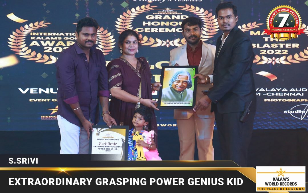 Born on 24-01-2020 From Chennai, Tamilnadu, India. She Has Created a New World Record by Identifying and Reciting Olympic Games -50,country Flag-32, Wonder of the World-27, Scientist and Innovations-27, Public Gathering Places-38, World Traffic Signs-45, Professionals-27, Still in Nature-24, Nature in Motion-24, Our Universe-19, Music Instruments-24,famous Religious Place of India-24,indian States and Leaders-49, Know of India-24,indian Festival and Famous Places-46, Things and Equipment in My Home-48,house Hold Things-103, Alphabetical Image Words-234, Various Puzzles- 101, Flowers and Trees-58, Insects, Birds and Animals-98, Sea Creatures-24, Transports-34, Body Parts-29, Food Items-25, Fruits and Vegetables-37, Actions Words-27, Colours and Shapes-24, Cosmetic and House Things-16. She Has Set a New World Record Dated 15-10-2022. This Achievement is Registered in Kalams World Records.