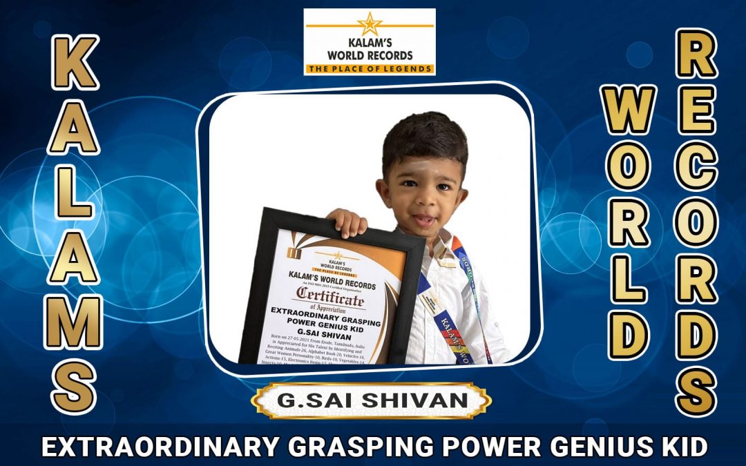 Born on 27-05-2021 From Erode, Tamilnadu, India is Appreciated for His Talent by Identifying and Reciting Animals – 26, Alphabet Book – 20, Vehicles – 16, Great Women Personality – 10, Birds – 10, Vegetables – 14, Actions -15, Electronics Items – 12, Shapes – 7, Fruits – 14, Insects – 10, Musical Instruments – 11, Fishes – 5, Flowers – 6, Sports – 10, Parts of the Body – 10, Wonders of the World – 7, Colors – 4. As We Kalam’s World Records Appreciating His Talent and Honoring Him in the Stage of Big Applause and for His Future Stepping Stone. Achievement Dated 07-09-2022. This Achievement is Registered in Kalam’s World Records.