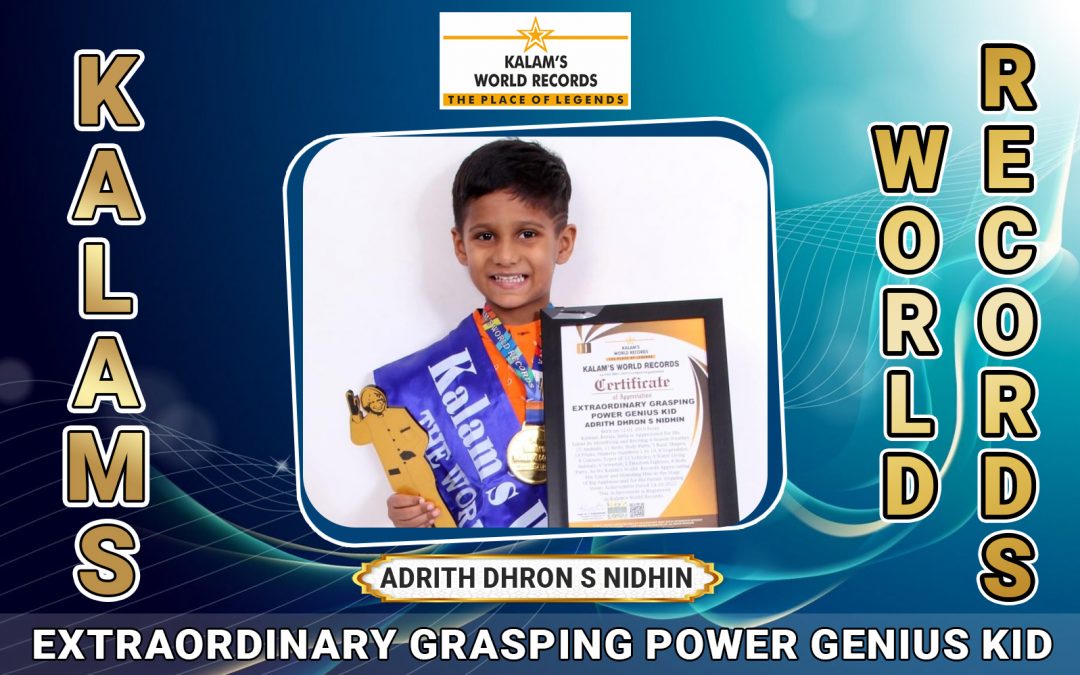 Born on 12-01-2019 From Kannur, Kerala, India is Appreciated for His Talent by Identifying and Reciting 4 Season Weather, 23 Animals,11 Birds, Body Parts, 5 Basic Shapes, 14 Fruits, Numeric Numbers 1 to 10, 8 Vegetables, 8 Colours, Types of 12 Vehicles, 9 Water Living Animals, 6 Scientist, 5 Freedom Fighters, 8 Body Parts. As We Kalam’s World Records Appreciating His Talent and Honoring Him in the Stage of Big Applause and for His Future Stepping Stone. Achievement Dated 14-10-2022. This Achievement is Registered in Kalam’s World Records.