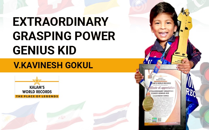 Born on 31-12-2017 from Thiruvananthapuram, Kerala, India. Is Appreciated for his Talent by Identifying 78 English words and Recites A to Z Alphabets and A to Z Objects, 3 Tamil Thirukkural, 1-10 Numbers, 7 Continents, 7 Rainbow Colours, 11 Flags, 4 House Rooms, 4 National Symbols, 29 States Capitals, 18 Gk Questions, 2 English Rhymes, 5 Malayalam Rhymes, 1 Hindi Rhyme, 30 Hindi Words English Meaning, 15 About Myself Questions, 16 Body Parts, 7 Days in a Week, 3 Traffic Colours. As we Kalam’s World Records Appreciating his Talent and honouring him in the stage of big