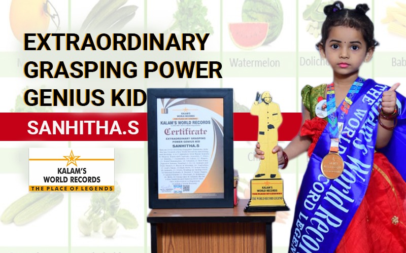 Born on 25-05-2018 from Bangalore, Karnataka, India. She has created a New World Record by Identifying and Reciting A to Z Alphabets With Phonic Sounds, 9- Planets, States and Capitals, Seasons, 7- Days, 12- Months, 7- Continents, 10- Colors, 12- Shapes,15- World Monuments, 14- Vehicles, 4- Directions, Digestive System, Numbers 1-50, 24- Animals and Their Homes, 6- Places of Worship, 24- Vegetables, 15- God’s Name, 34 Body Parts, 55 Action Words, 50 Animals, 21- Fruits, Reading an Analog Clock, 14 National Symbols, 8- Flowers, 5- Sense Organs, 9 Animal Sounds 11- Electronic, 9- Stationary, 16- Birds, 20 Young Ones of Animals. She Set a New World Record Dated on 30-07-2021. This Achievement is Registered in Kalam’s World Records.