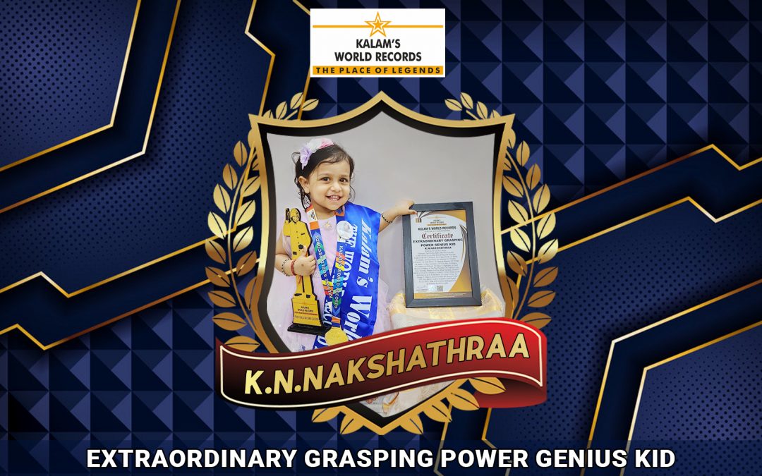 Born on 10-04-2021 In Chennai, Tamilnadu, India. She Has Created a New World Record by Identifying and Reciting Flash Cards of 13 Shapes, 24 Action Words, 23 Birds, 24 Fruits, 24 Vegetables, 42 Animals, 11 colors, 8 Flowers, 24 Body Parts, 55 General Objects, 46 Things at Home, 19 Sea Creatures, 24 Vehicles, 14 Nature, 8 Community Helpers, 10 Flags, 9 Alphabet, 85 Real Objects at Home, to Do Few Puzzles Like Stacked Cup, Color Sorting, Shapes Sorting, Ring Stacking, Shadow Match of Objects, 8 Animal Sounds, 6 Word Flash Cards, Alphabet a to G, Body Parts, 10 Colors From the Group of Objects, Shapes From the Objects Total 475. She Has Set a New World Record Dated 02-11-2022. This Achievement is Registered in Kalams World Records.