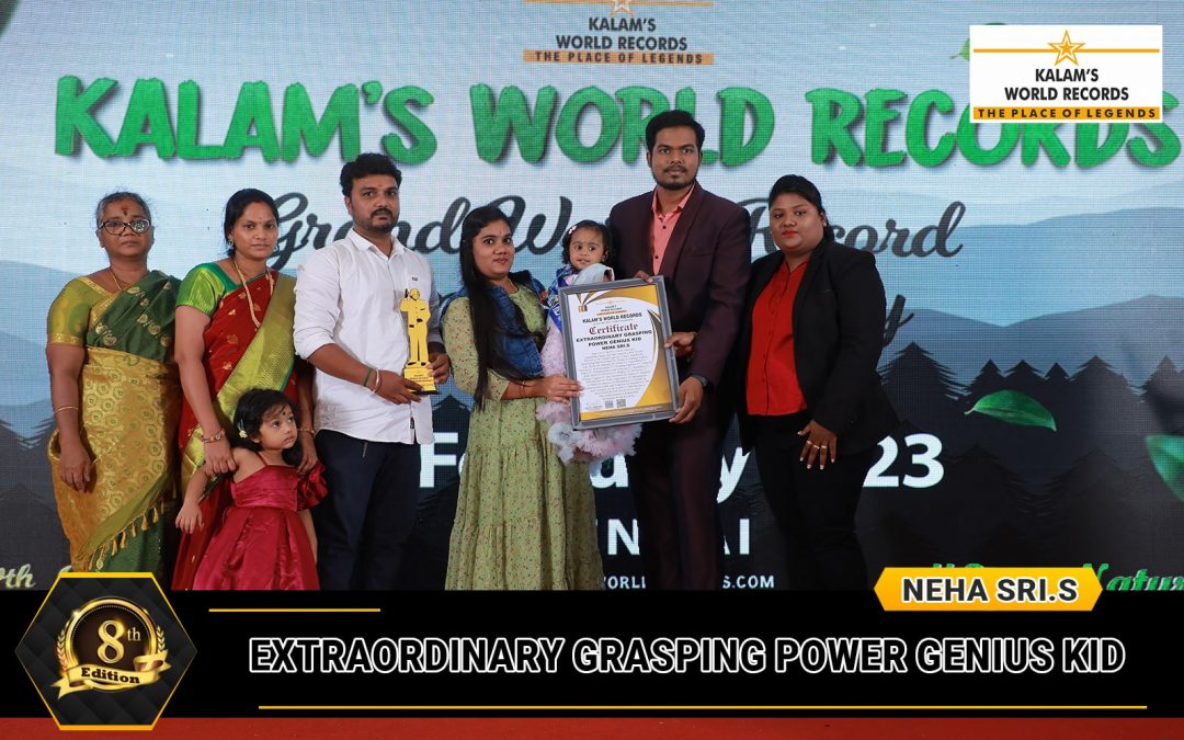Born on 17-08-2021 From Chennai, Tamilnadu, India. She Has Created a New World Record at the Tender Age of 1 Year 2 Months by Identifying and Reciting 610 Things in Various Topics Like Birds – 28, Animals – 28, Fruits – 27, Vegetables – 27, Actions – 27, Professionals – 27, Freedom Fighters -27, Country Flags – 27, Transportation and Vehicles – 27 , Alphabets – 27 , Body Parts – 25, Flowers – 27, Shapes – 14, Inventors – 27, Human Organs – 27, Sea Creatures – 26, Space – 27 , Musical Instruments – 24, Leafy Vegetables – 24, Monuments of India – 24, Insects – 24, Monuments of World – 24, Construction Tools and Vehicles – 24 , Numbers (1 – 20) and Wonders of the World – 27. She Has Set a New World Record Dated 26-10-2022. This Achievement is Registered in Kalams World Records.