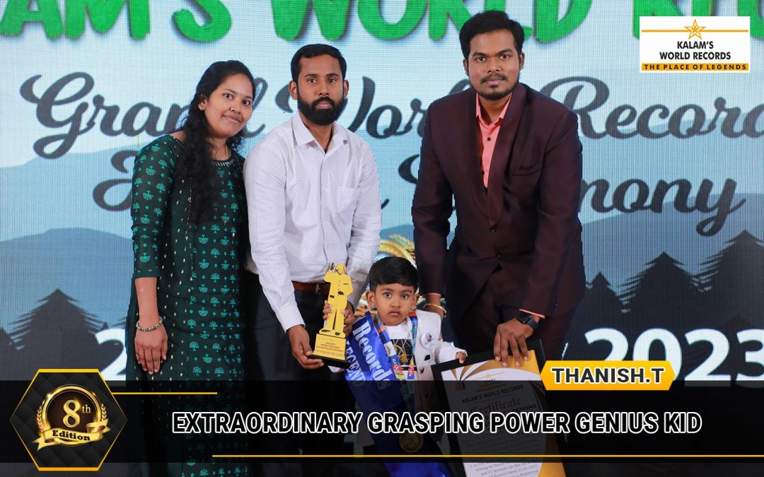 Born on 20-11-2019 From Chennai, Tamilnadu, India. He Has Created a New World Record by Reading 15 Phonics Books in 20 Minutes and 55 Seconds, Read 163 Word Cards, Read 106 Sight Words, Numbers From 1 to 100, Recalled 519 Picture Card Names, Solved 60 Pieces Puzzle in 10 Minutes and 53 Seconds. He Has Set a New World Record Dated 25-02-2023. This Achievement is Registered in Kalams World Records.