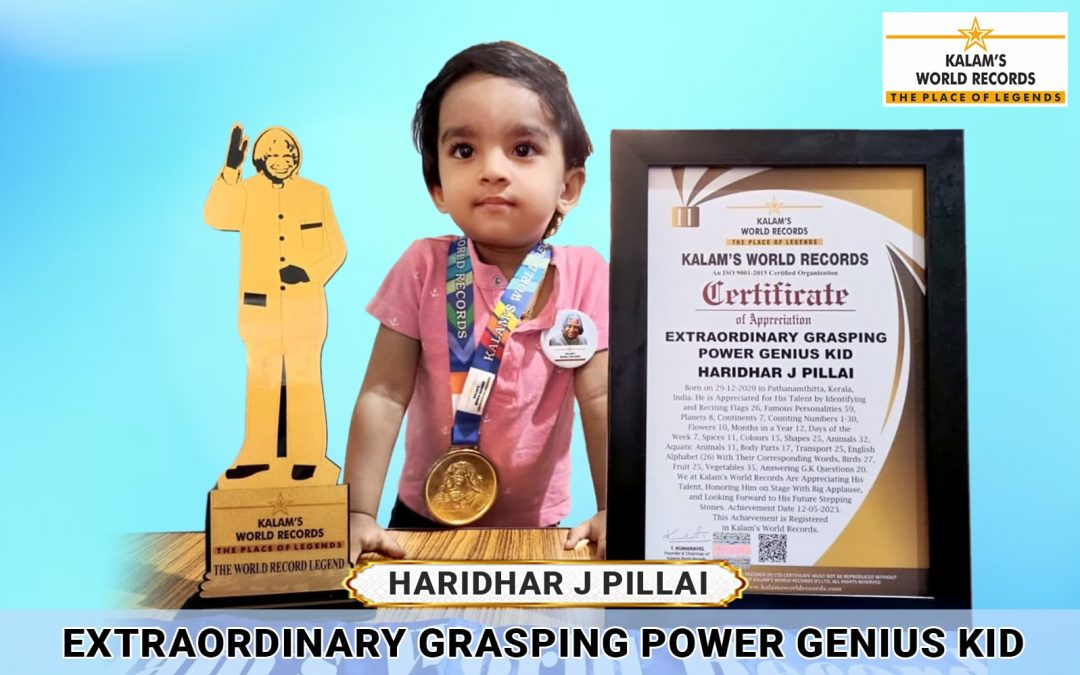 Born on 29-12-2020 in Pathanamthitta, Kerala, India. He is Appreciated for His Talent by Identifying and Reciting Flags-26, Famous Personalities-59, Planets -8, Continents -7, Counting Numbers 1-30, Flowers -10, Months in a Year -12, Days of the Week-7, Spices -11, Colours -15, Shapes -25, Animals-32, Aquatic Animals -11, Body Parts -17, Transport -25, English Alphabet (26) With Their Corresponding Words, Birds-27, Fruit-25, Vegetables -35, Answering G.k Questions -20. We at Kalam’s World Records Are Appreciating His Talent, Honouring Him on Stage With Big Applause, and Looking Forward to His Future Stepping Stones.