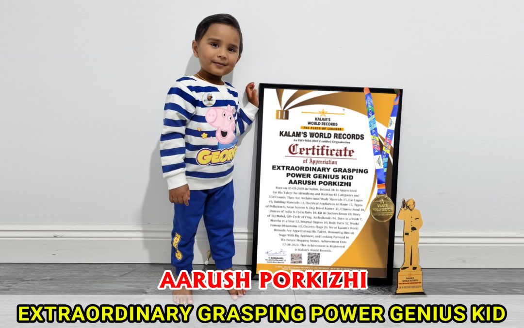 Born on 05-09-2020 in Dublin, Ireland. He is Appreciated for His Talent for Identifying and Reciting 43 Categories and 550 Counts, They Are Architectural Study Materials 15, Car Logos 49, Building Materials 13, Electrical Appliances in Home 15, Types of Pollution 6, Solar System 8, Dog Breed Names 11, Chinese Food 10, Dances of India 9, Cycle Parts 10, Kit in Doctors Room 10, Story of Taj Mahal, Life Cycle of Frog, Aathichoodi -14, Days in a Week 7, Months in a Year 12, Internal Organs 10, Body Parts 32, World Famous Mountains 13, Country Flags 26. We at Kalam’s World Records Are Appreciating His Talent, Honouring Him on Stage With Big Applause, and Looking Forward to His Future Stepping Stones.