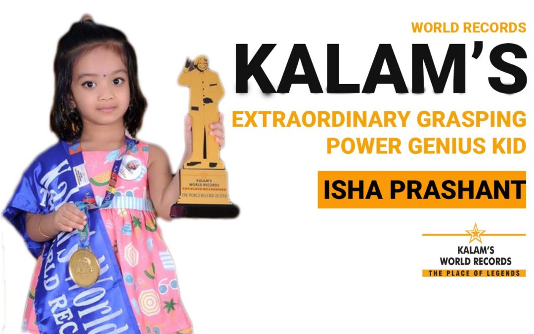 11 colors, 8-shapes, a combination of color and shapes, identified 74 objects by seeing the image,19-body parts and finger names,13-actions, days of the week and months of the year, numbers 1 to 30, answer 6-gk questions,12-vehicles,31-animals,9-birds,6-vegetables,9-fruits. She set a new world record dated on 08-08-2021. This achievement is registered in Kalam’s World Records.