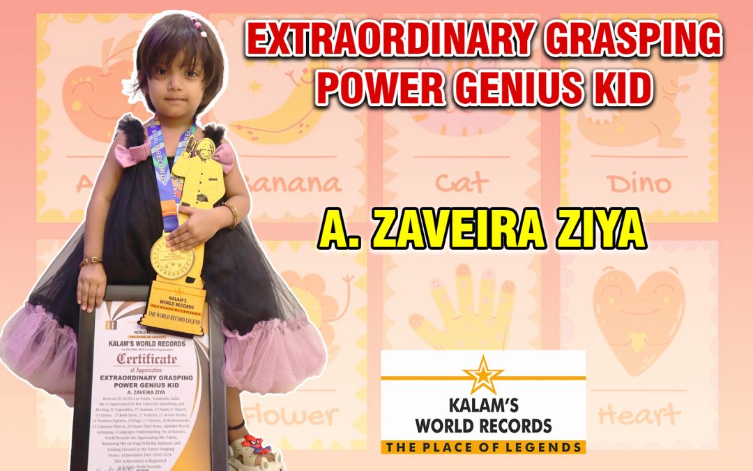 21 Vehicles, 27 Action Words, 14 Freedom Fighters, 10 Flags, 13 Flowers, 20 Professionals, 25 Common Objects, 20 House Hold Items, Alphabet Puzzle Arranging, 4 Languages Understanding. We at Kalam’s World Records Are Appreciating Her Talent, Honouring Her on Stage With Big Applause, and Looking Forward to Her Future Stepping Stones. Achievement Date 20-02-2024. This Achievement is Registered in Kalam’s World Records.