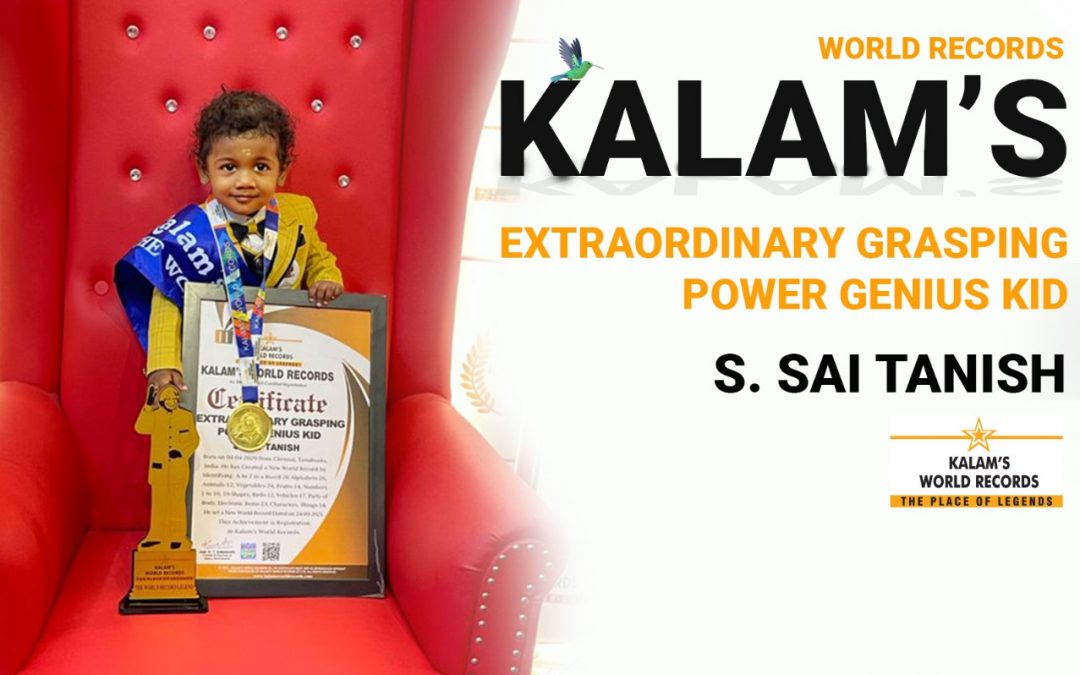 Born on 04-04-2020 from Chennai, Tamilnadu, India. He has created a New World Record by Identifying A to Z in a Board 26 Alphabets-26, Animals-12, Vegetables-24, Fruits-14, Numbers 1 to 10, 10-Shapes, Birds-12, Vehicles-17, Parts of Body, Electronic Items-13, Characters, Things-14. He set a New World Record Dated on 24-09-2021. This Achievement is Registration in Kalam’s World Records.