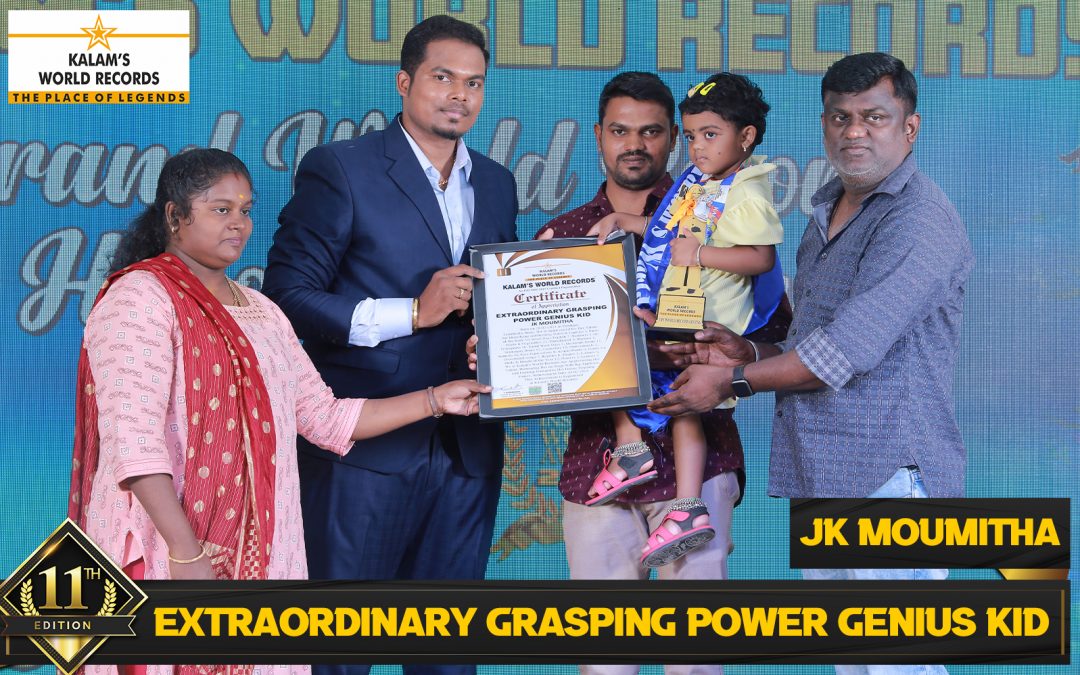 Born on 28-02-2021 in Dindigul, Tamilnadu, India. She is appreciated for her talent for identifying States & capitals 5, Parts of the body 10, Week days English 7, Numbers 1-10 10, Fruits & vegetables 21, Thirukkural 3, Rymes 3, Transport names 16, Tamil week days 7, Electronic items 11, Stationary items 15, Cosmetics 19, Professional 5, Animals 16, Face expression 8, Action of words 9, Food names 34, Devotional 7, Reptiles 6, Shapes 5, Colours 5, Birds 8, Year of the month 12, Flowers 5, Leaders 5. We at Kalam’s World Records are appreciating her talent, honouring her on stage with big applause, and looking forward to her future stepping stones. Achievement Date 01-02-2024. This achievement is registered in Kalam’s World Records.