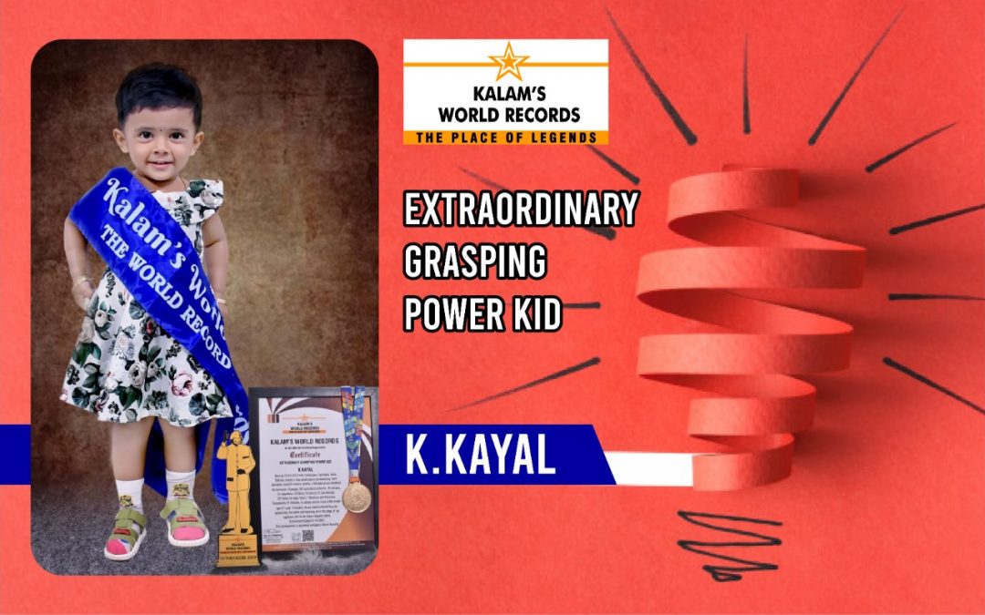K.KAYAL born on 13-12-2018 in Coimbatore, Tamilnadu, India. She has created a new world record by reciting 4 Memory poems, 2 Thirukkural and recognized Tamil alphabets sound, Names of 74 people, 30 Agricultural products,29 Animals,25 Vegetables,23 Birds,16 Insects,13 Sea Animals,32 Foods,19 Body Parts,11 Electrical and Electronic Equipments,17 Vehicles,8 colours and so many at the tender age of 1 year 11 months. As we Kalam’s World Records appreciating her talent and honouring her in the stage of big applause for her future stepping stone.