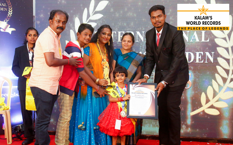Born on 18-01-2017 from Trichy, Tamilnadu, India.She has created a new world record by identifying and Reciting 29 states and its capital of India,38 districts in Tamil Nadu,7 union territory, Tamilnadu states national symbols, national symbols (21) 14 districts in Kerala state, Kerala state national symbols, Books and its authors (20), National anthem, Tamil Thaai vazhthu,