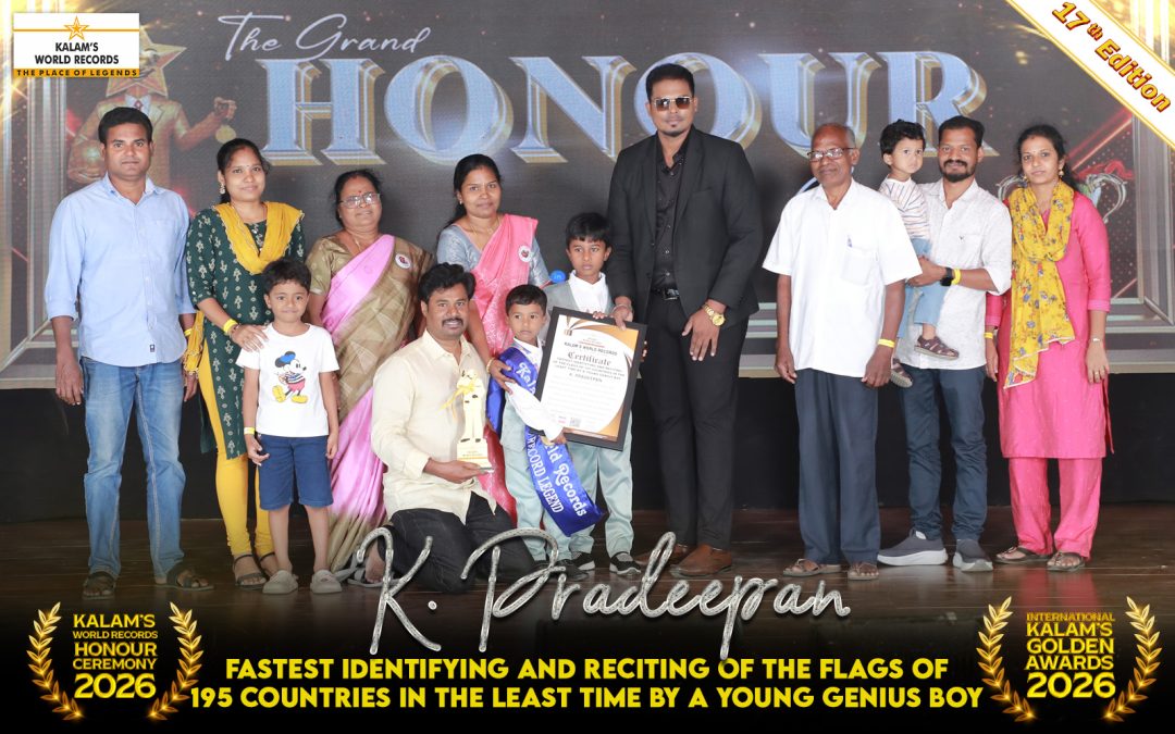 Born on 29-08-2020 in Trichy, Tamil Nadu, India. He Has Created a New World Record for the Fastest Identifying and Reciting of the Flags of 195 Countries in the Least Time of 1 Minute and 28 Seconds. This Achievement Was Successfully Accomplished on 15-02-2026 and Has Been Officially Recognized and Registered by Kalam’s World Records.