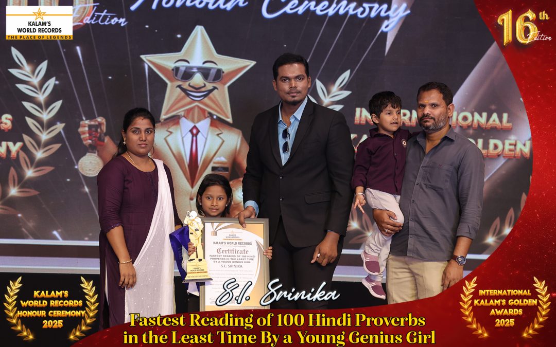 Born on 18-06-2017 in Kancheepuram, Tamil Nadu, India. She has created a New World Record for the fastest reading of 100 Hindi Proverbs in the least time of 2 Minutes and