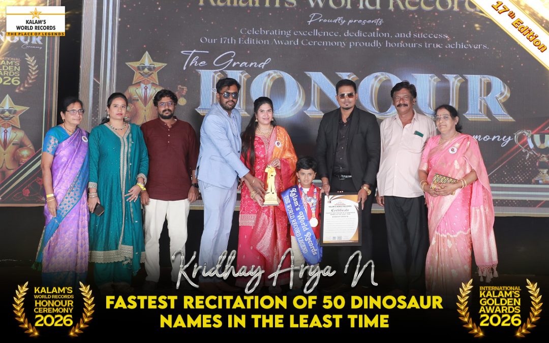 Born on 25-04-2022 in Kallakurichi, Tamil Nadu, India. He has created a new world record for the fastest recitation of 50 dinosaur names in the least time of 42 seconds and he has set a new world record. This outstanding achievement was successfully accomplished on 04-02-2026 and has been officially recognized and registered by Kalam’s World Records.