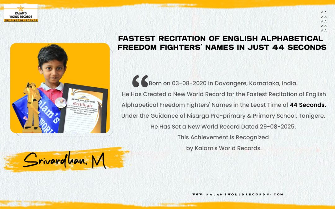 Born on 03-08-2020 in Davangere, Karnataka, India. He Has Created a New World Record for the Fastest Recitation of English Alphabetical Freedom Fighters’ Names in the Least Time of 44 Seconds, under the Guidance of Nisarga Pre-primary & Primary School, Tanigere. He Has Set a New World Record Dated 29-08-2025. This Achievement is Recognized by Kalam’s World Records.