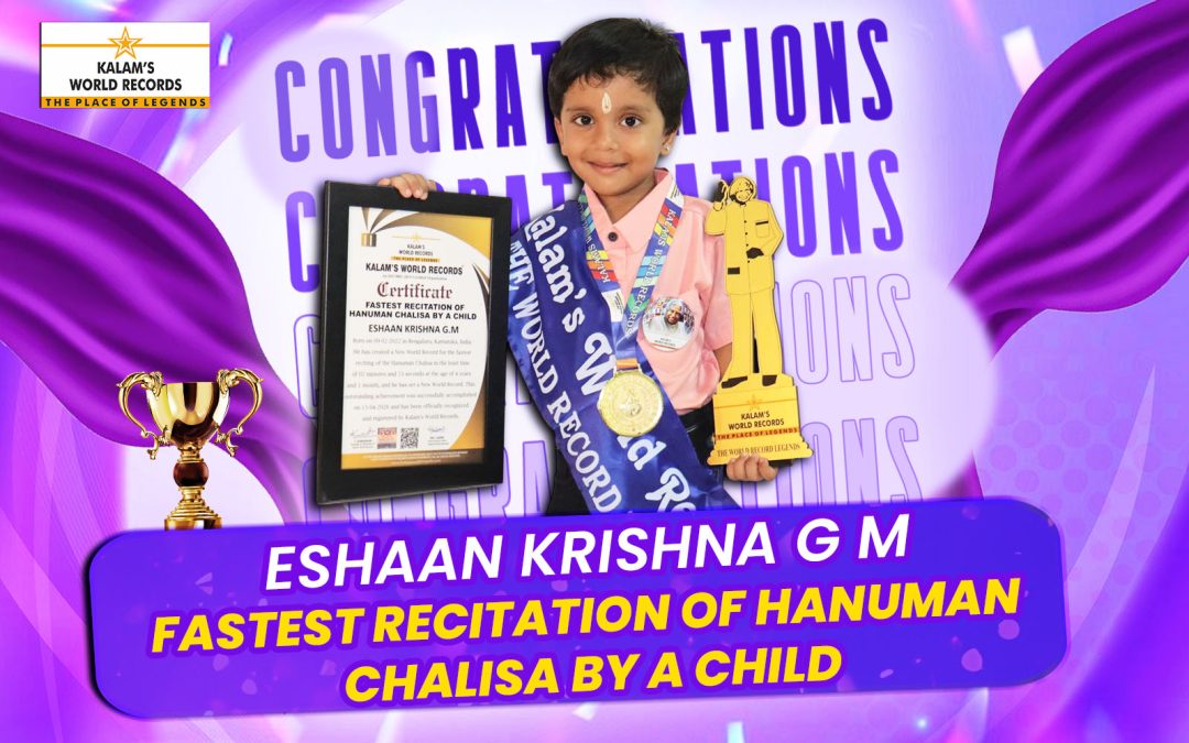 Born on 09-02-2022 in Bengaluru, Karnataka, India. He Has Created a New World Record for the Fastest Reciting of the Hanuman Chalisa in the Least Time of 02 Minutes and 53 Seconds at the Age of 4 Years and 1 Month, and He Has Set a New World Record. This Outstanding Achievement Was Successfully Accomplished on 15-04-2026 and Has Been Officially Recognized and Registered by Kalam’s World Records.