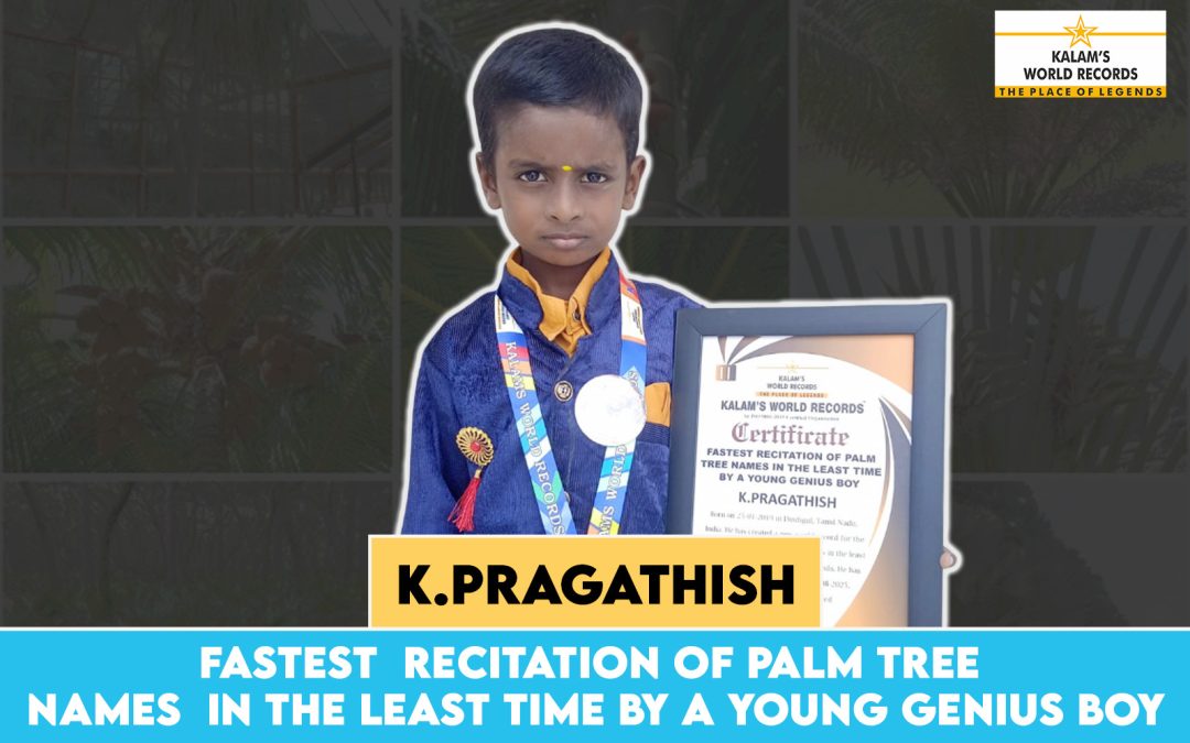 Born on 25-01-2019 in Dindigul, Tamil Nadu, India. He Has Created a New World Record for the Fastest Recitation of Palm Tree Names in the Least Time of 16 Seconds and 80 Milliseconds. He Has Set a New World Record Dated 18-08-2025. This Achievement is Recognized by Kalam’s World Records.