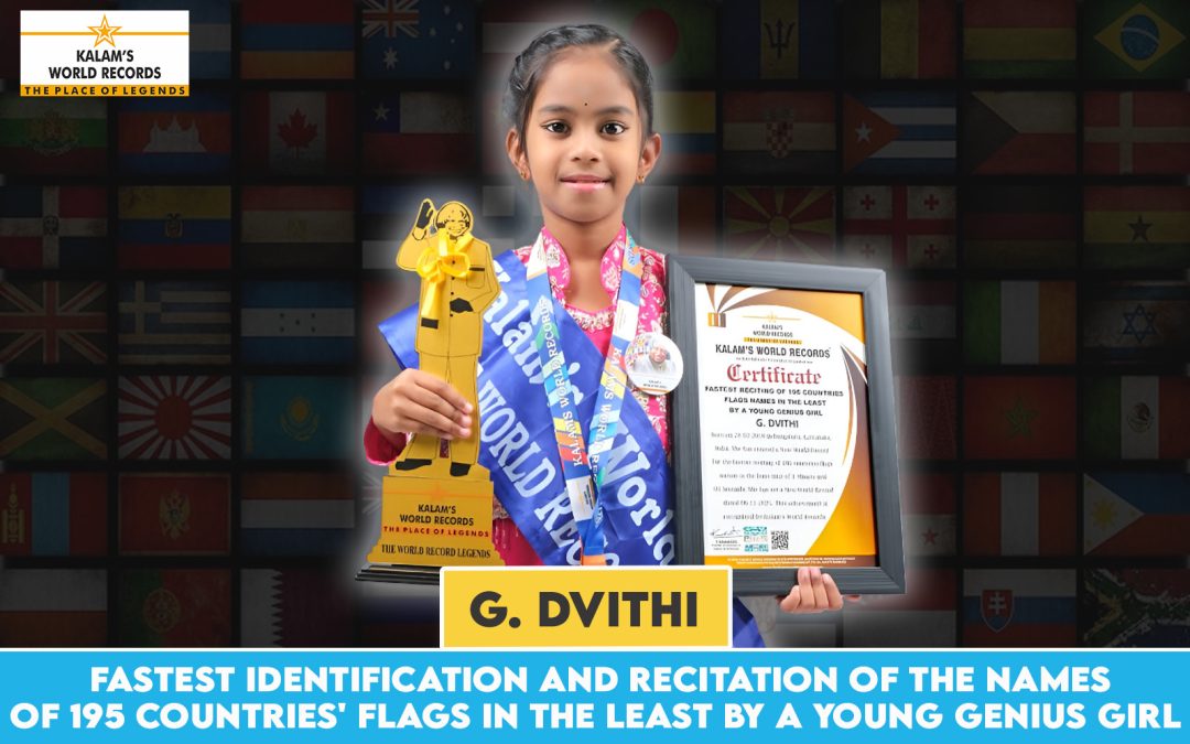Born on 28-02-2018 in Bengaluru, Karnataka, India. She Has Created a New World Record for the Fastest Identifying and Reciting of the Names of 195 Countries’ Flags in the Least Time of 1 Minute and 03 Seconds. She Has Set a New World Record Dated 06-11-2025. This Achievement is Recognized by Kalam’s World Records.