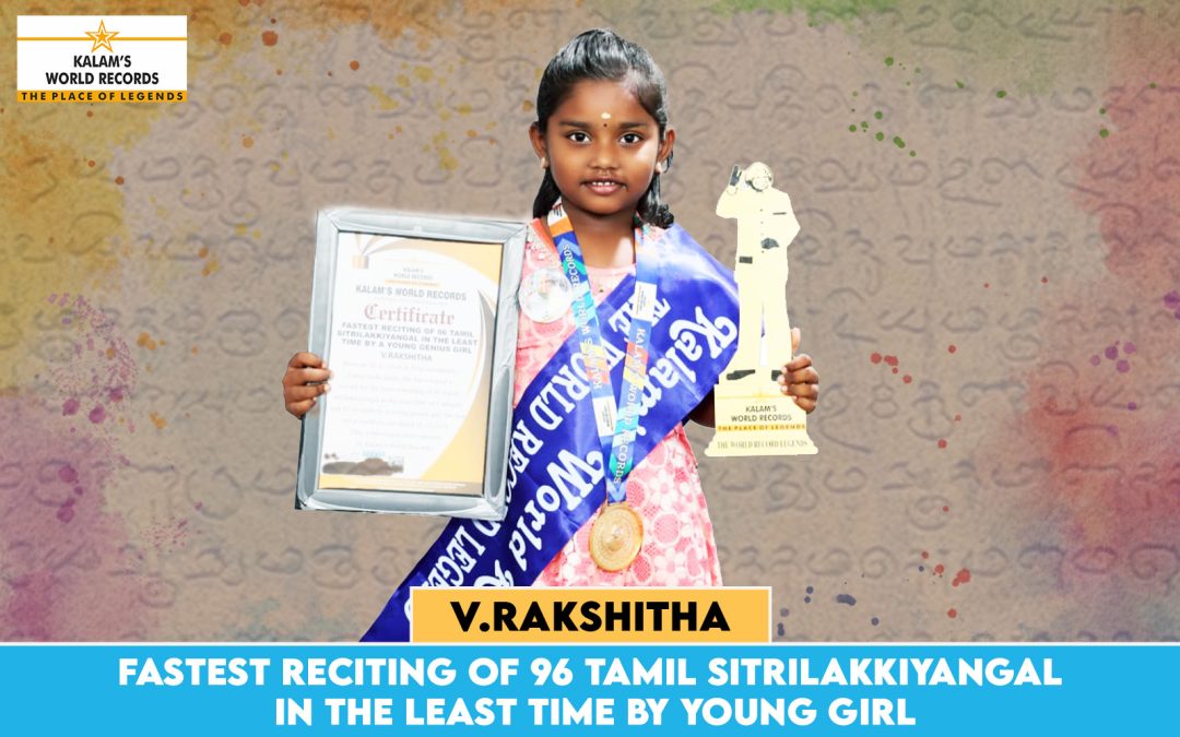 Born on 31-12-2018 in Tiruvannamalai, Tamilnadu, India.She has created a Record for the Fastest Reciting of 96 Tamil Sitrilakkiyangal in the Least Time of 1 Minute and 03 Seconds by Young Girl. She has set a World Record Dated 16-12-2024. This achievement is Recognised by Kalam’s World Records.