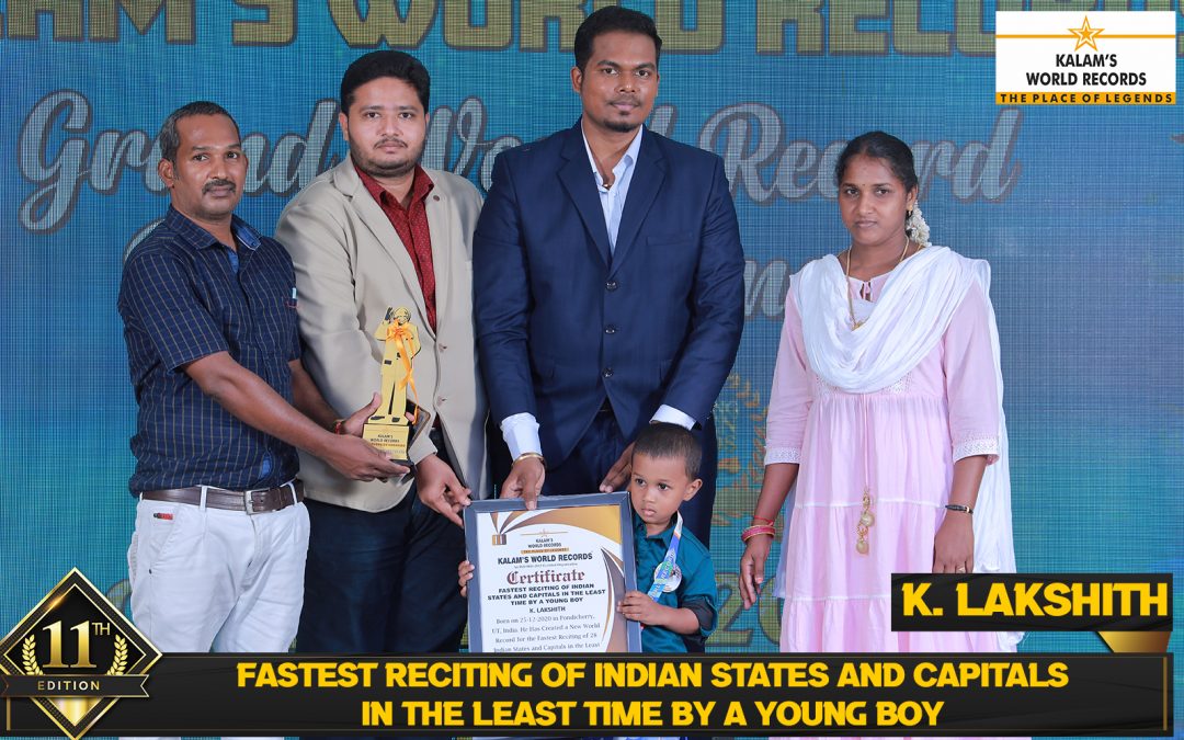 Born on 25-12-2020 in Pondicherry, Ut, India. He Has Created a New World Record for the Fastest Reciting of 28 Indian States and Capitals in the Least Time of 23 Seconds. He Has Set a New World Record Dated 31-12-2023. This Achievement is Registered in Kalams World Records.