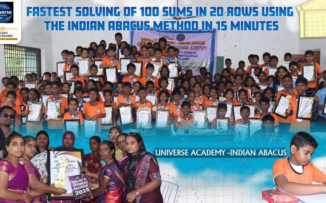 Has Organized A Group World Record Attempt record for FASTEST SOLVING OF 100 SUMS IN 20 ROWS USING THE INDIAN ABACUS METHOD IN 15 MINUTES.