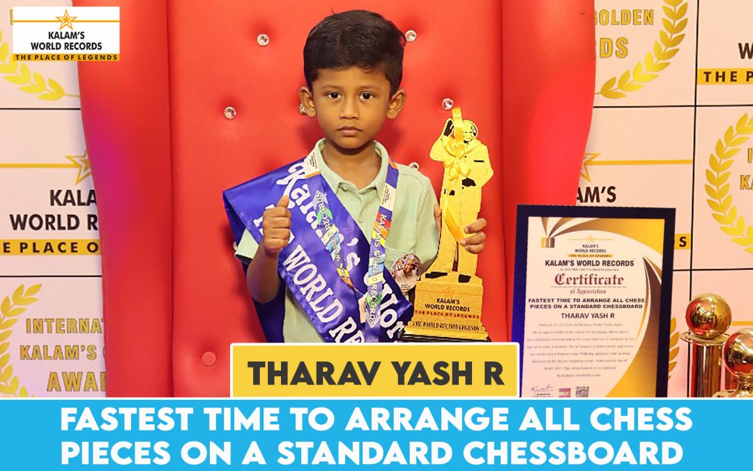 Born on 22-12-2020 in Chennai, Tamil Nadu, India. He is Appreciated for His Talent for Arranging Chess Pieces on a Standard Chess Board in the Least Time of 31 Seconds at the Age of 4 Years 4 Months. We at Kalam’s World Records appreciate His Talent and Honor Him on Stage With Big Applause, and look forward to His Future Stepping Stone. Achievement Dated 08-05-2025. This Achievement is Recognized by Kalam’s World Records.