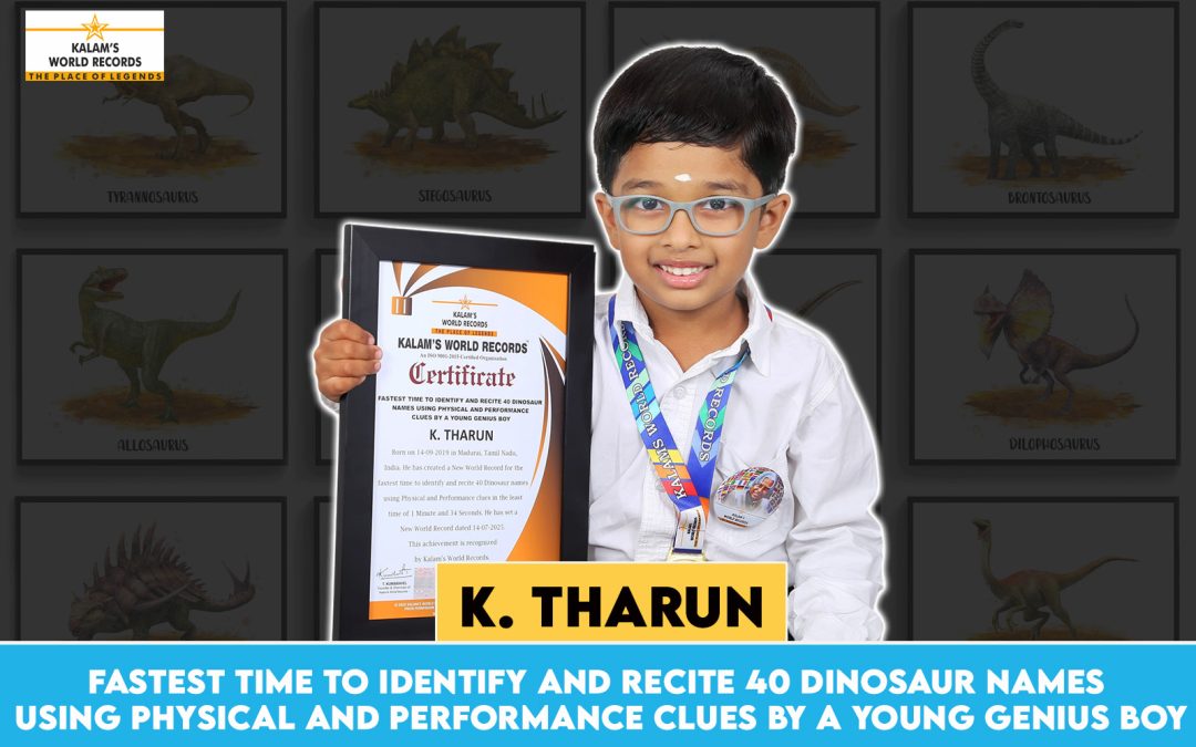 Born on 14-09-2019 in Madurai, Tamil Nadu, India. He Has Created a New World Record for the Fastest Time to Identify and Recite 40 Dinosaur Names Using Physical and Performance Clues in the Least Time of 1 Minute and 34 Seconds. He Has Set a New World Record Dated 14-07-2025. This Achievement is Recognized by Kalam’s World Records.