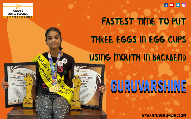 Guruvarshine from Chennai, Tamilnadu, India. She has created a new world record by doing Fastest time to put three eggs in egg cups using mouth in backbend is 15.49 seconds. Measurement