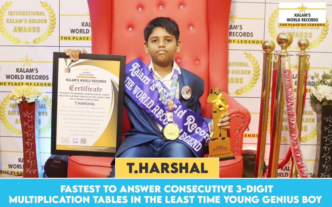 Born on 19-12-2013, From Stem – Smart Enliven Memory, Chennai, Tamil Nadu, India. He Has Created a New World Record for Fastest to Answer Consecutive 3-digit Multiplication Tables in the Least Time of Below 15 Seconds by a Young Genius Boy. He Has Set a New Record Dated 09-06-2025. This Achievement is Recognised by Kalam’s World Records.