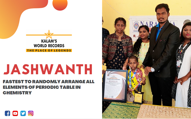 Born on 13-07-2014 in Chennai, Tamil Nadu. He has created another new world record by The Fastest Time to Randomly Arrange All Elements of Periodic Table in Chemistry with Continues to Answers Mental Math Single Digit 3 Rows Addition and Subtraction in Abacus is 5 Minutes 20 Seconds and set a new world record dated on 03-13-2021. This achievement is registered in Kalam’s World Records.