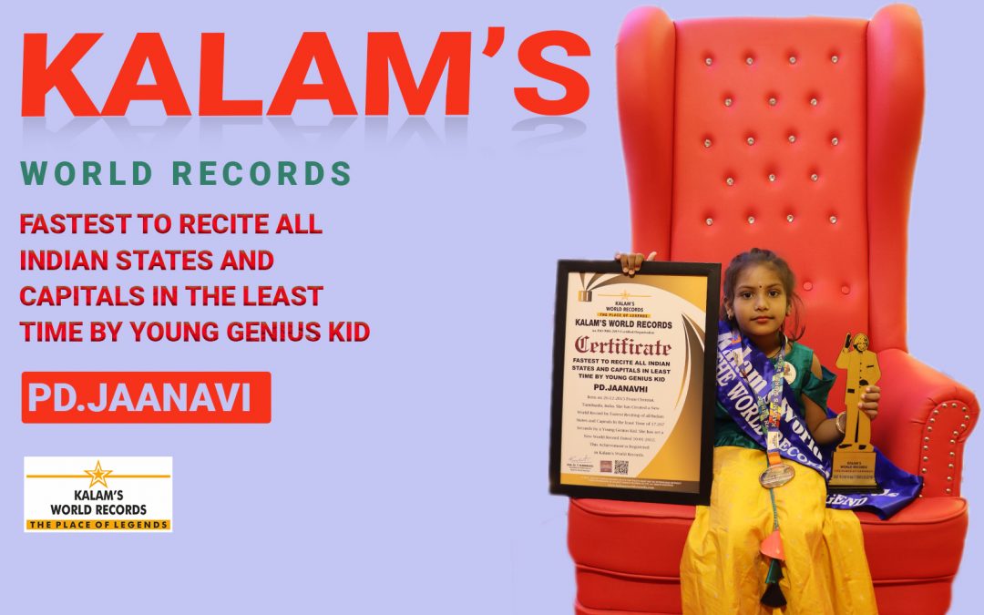 Born on 26-12-2015 from Chennai, Tamilnadu, India. She has created a new world record by Fastest Reciting of all Indian states and Capitals In the least time of 17.207 Seconds by a young genius kid. She has set a new world record dated 10-01-2022. This achievement is registered in Kalam’s World Records.