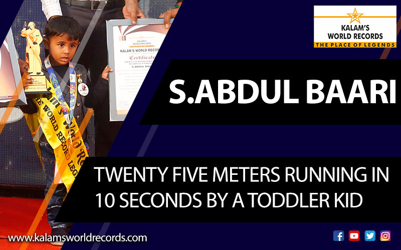 Born on 05-01-2018 from Natham-Dindigul, Tamilnadu,India.He has created a new world record by running a hundred meters in 47 seconds at the tender age of 2 years 9 months and set a new world record dated on 31-10-2020.