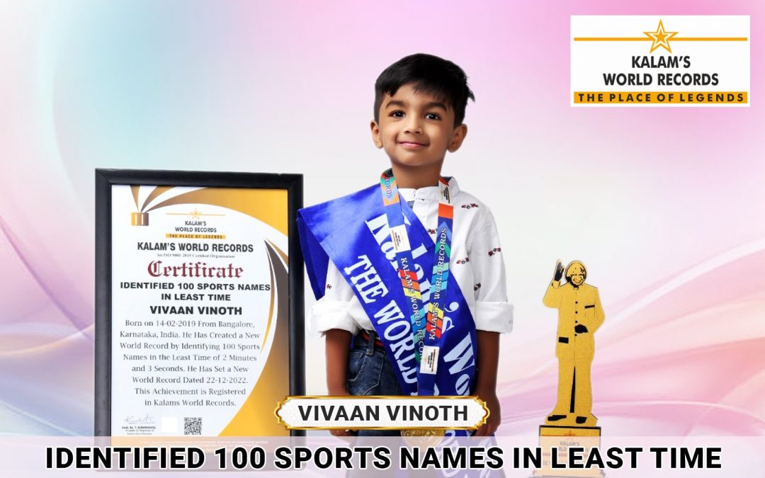 Born on 14-02-2019 From Bangalore, Karnataka, India. He Has Created a New World Record by Identifying 100 Sports Names in the Least Time of 2 Minutes and 3 Seconds. He Has Set a New World Record Dated 22-12-2022. This Achievement is Registered in Kalams World Records.