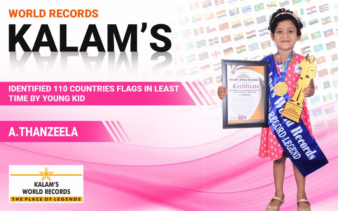 Born on 18-03-2018 From Tenkasi, Tamilnadu, India. She Has Created a New World Record by Identifying 110 Countries Flags in the Least Time of 152 Seconds by Young Kid. She Has Set a New World Record Dated on 03-04-2022. This Achievement is Registered in Kalam’s World Record.