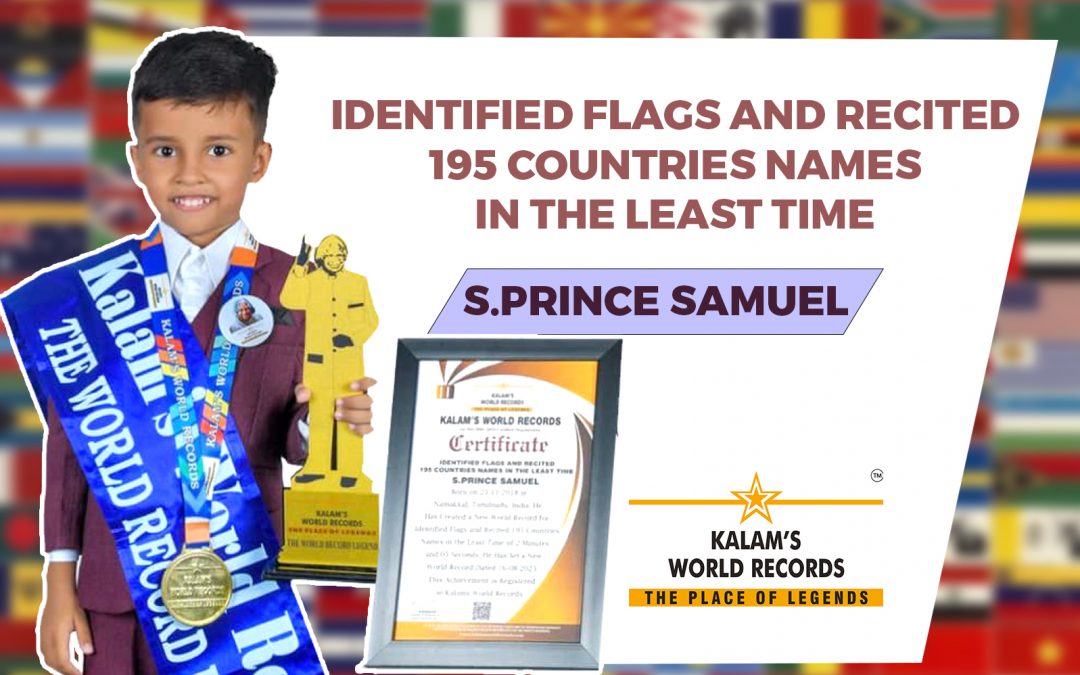 Born on 23-11-2018 in Namakkal, Tamilnadu, India. He has created a New World Record for Identified Flags and Recited 195 Countries Names in the Least Time of 2 Minutes and 05 Seconds. He Has Set a New World Record Dated 16-08-2023. This Achievement is Registered in Kalams World Records.