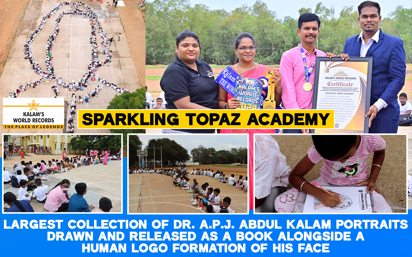 Sparkling Topaz Academy, Ramanathapuram, Tamilnadu, India Has Organized a Group World Record Attempt of the Largest Collection of DR. APJ Abdul Kalam Portraits Drawn and Released as a Book Alongside a Human Logo Formation of His Face. A Team Successfully Participated and Completed the Group World Record Attempt With 200 and Above Students. This Event is Organized by Sparkling Topaz Academy Ramanathapuram. This Record is Dated 13-10-2024. This Achievement is Recognized by Kalam’s World Records.