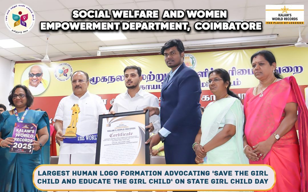 Attempt for Largest Human Logo Formation Advocating ‘Save the Girl Child & Educate the Girl Child’ on State Girl Child Day 2025. A Team Successfully Participated and Completed The Group World Record Attempt With 4000 And Above members. This event is organized by the district collector, Thiru PAVANKUMAR G.GIRIYAPPANAVAR, and I.A.S. & Mrs.R. AMBIKA MSc, DSWO. SOCIAL WELFARE AND WOMEN EMPOWERMENT DEPARTMENT, COIMBATORE.Venue: Dr. N. G. P. ARTS & SCIENCE COLLEGE, COIMBATORE. This Record Is Dated 24-02-2025.