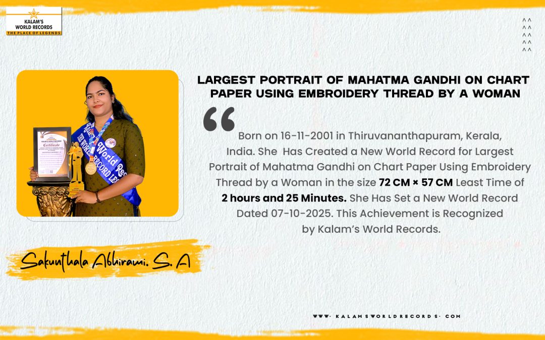 Born on 16-11-2001 in Thiruvananthapuram, Kerala, India. She Has Created a New World Record for Largest Portrait of Mahatma Gandhi on Chart Paper Using Embroidery Thread by a Woman in the size 72 CM × 57 CM Least Time of 2 hours and 25 Minutes. She Has Set a New World Record Dated 07-10-2025. This Achievement is Recognized by Kalam’s World Records.