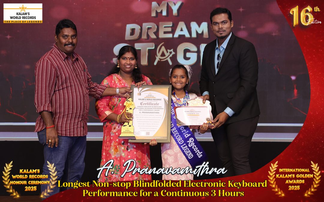 Born on 17-11-2014 in Coimbatore, Tamil Nadu, India. She Has Created a New World Record for the Longest Non-stop Blindfolded Electronic Keyboard Performance for a Continuous 3 Hours and 15 Minutes. She Has Set a New World Record Dated 30-08-2025. This Achievement is Recognized by Kalam’s World Records.