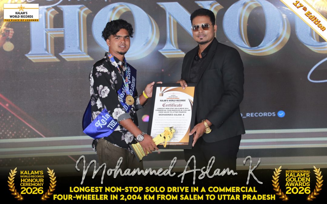 Born on 07-05-2004 in Tiruppur, Tamil Nadu, India. He Has Created a New World Record for the Longest Non-stop Solo Drive in a Commercial Four-wheeler (Model Tata 710) in 2,004 Km for 33 Hours and 18 Minutes From 26-12-2025 to 27-12-2025 (Salem to Uttar Pradesh) and Has Set a New World Record. This Outstanding Achievement Was Successfully Accomplished on 21-01-2026 and Has Been Officially Recognized and Registered by Kalam’s World Records.