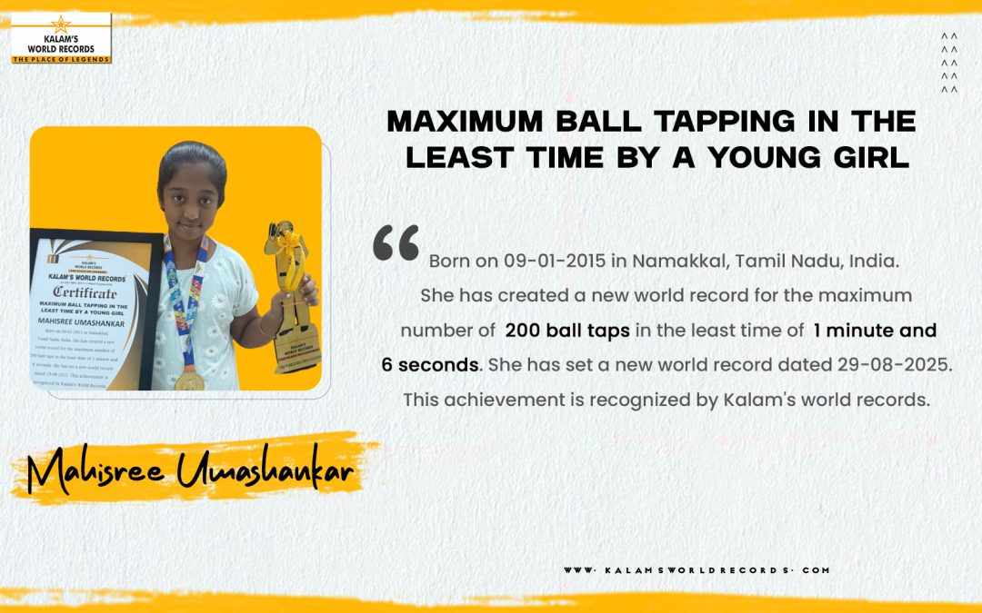 Born on 09-01-2015 in Namakkal, Tamil Nadu, India. She Has Created a New World Record for the Maximum Number of 200 Ball Taps in the Least Time of 1 Minute and 6 Seconds. She Has Set a New World Record Dated 29-08-2025. This Achievement is Recognized by Kalam’s World Records.