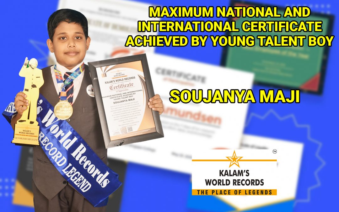 Born on 25-07-2013 in Howrah, West Bengal. He is Appreciated for His Talent for Achieving the Maximum Number of National and International Achievement Certificates by a Young Boy. We at Kalam’s World Records Are Appreciating His Talent, Honoring Him on Stage With Big Applause, and Looking Forward to His Future Stepping Stones.