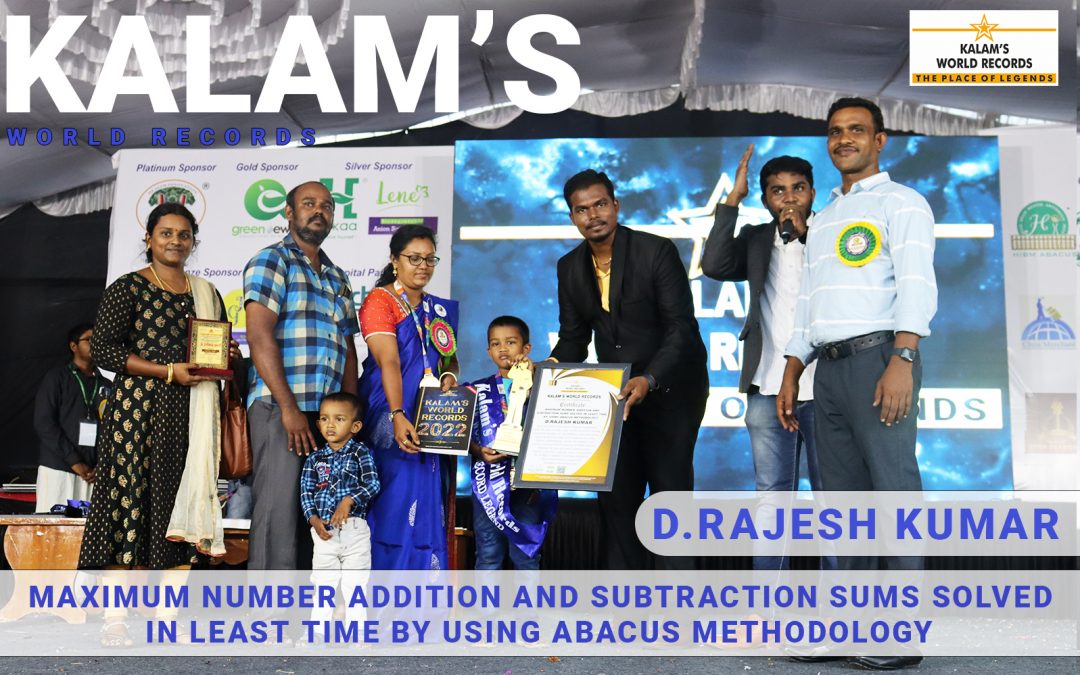 Born on 03-02-2016 from Chennai, Tamilnadu,India.He has created a new world record by solving maximum number of 700 addition and subtraction sums in the least time of 30 minutes by using abacus methodology, Under the guidance of GANGA JAGANATHAN Director of HIBM Abacus, Chennai. He has set a new world record dated 24-04-2022 and the event is organised by WORLD TAMIZH CULTURAL SOCIETY.This achievement is registered in Kalam’s World records.