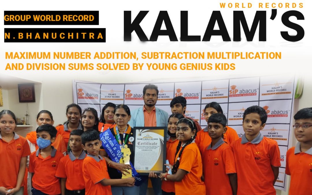LCL of SIP ABACUS kk Nagar Chennai, Tamilnadu, India had Created a New World Record on MAXIMUM NUMBER ADDITION, SUBTRACTION, MULTIPLICATION AND DIVISION SUMS SOLVED BY YOUNG GENIUS KIDS SIP ABACUS Chennai, India have Organized an Event of Group World Record by Solving Maximum Number Addition, Subtraction, Multiplication and Division Sums. SIP ABACUS had Successfully Participated with 13 Participants. Venue: KK Nagar, Chennai. They set a New World Record Dated on 22-11-2021. This Achievement is Registered in Kalam’s World Records.