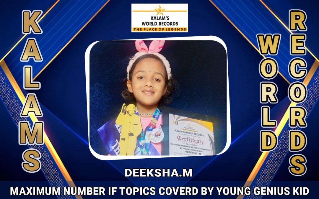 Born on 14-10-2016 From Mysore, Karnataka, India is Appreciated for Her Talent by Identifying and Reciting Maximum Number of 31 Topics Covered by Young Genius Kid. As We Kalam’s World Records Appreciating Her Talent and Honouring Her in the Stage of Big Applause and for Her Future Stepping Stone. Achievement Dated 27-03-2022. This Achievement is Registered in Kalam’s World Records.